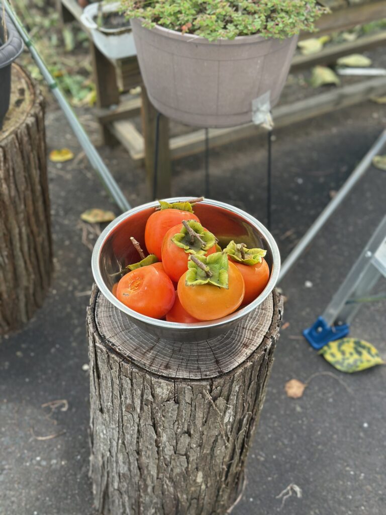 庭に置いてある丸太は撮影スポットとして大活躍。柿はこれで2kgくらいある